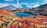 NuevoCuadro de madera de 150 x 90 cm: emocionante vista otoñal del lago Cheserys (Lac De Cheserys), ubicación de Chamonix, espléndida escena matutina de la reserva natural (148888887)- Diseño de impresión artística: diseño sin bordes en madera de 12 mm de grosor, viene con un soporte de pared seguro para un fácil montaje.